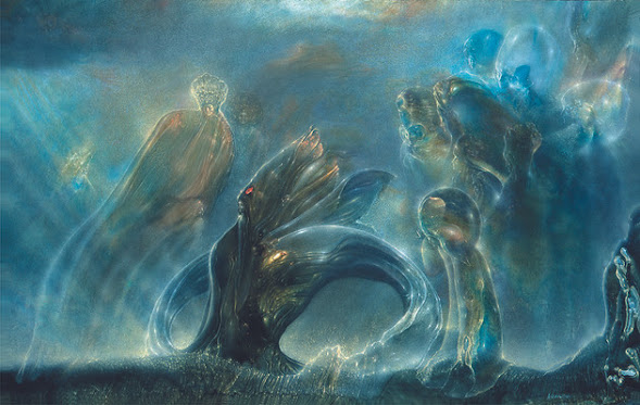 Feelings of serenity and peace aren't generally the first thing I would associate with depictions of colossal supernatural entities, but that is exactly what I feel looking at Annunciation II. Those feelings are helped along by the predominantly blue-green hues and bright tones. Form is again crucial, these creatures appear soft and elegantly flowing. They blend in with their environment, and appear to be gathered harmoniously. Their smooth textural appearance and transparency is suggestive of water. Venosa wisely appealed to the senses rather than the rational brain: his forms are inexact and suggestive in an impressionistic way. I can read them but can't fully comprehend them, and so there is a great sense of awe and wonder. This place appears exalted and heavenly in a way that comes across as more real and believable than classical depictions of heaven and angels.